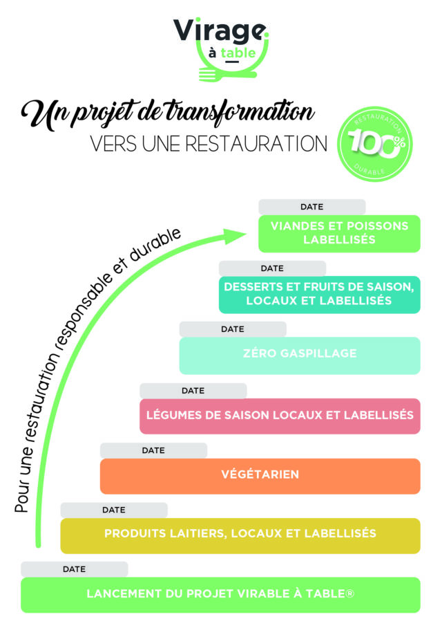 2019, une nouvelle étape : le projet Virage à table® est créé, de la volonté de proposer une méthode opérationnelle de transformation de la restauration vers une restauration « 100% Durable ».