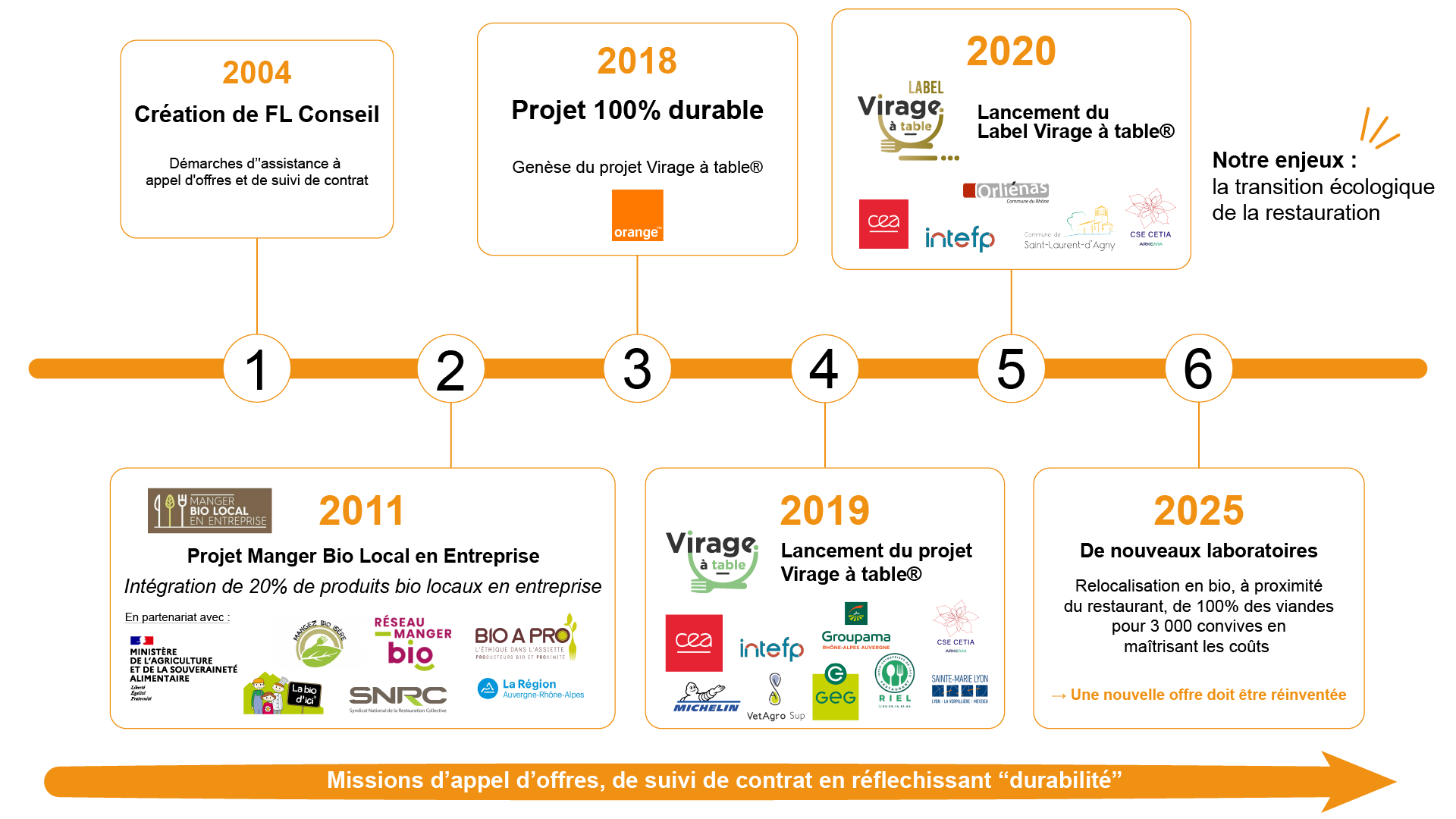 FL Conseil accompagne depuis plus de 15 ans ses clients pour créer la restauration de demain, une restauration responsable et durable. Ceci a donné naissance à des expérimentations, comme le projet Manger Bio Local en Entreprise né en 2011 en partenariat avec le monde institutionnel (FRAB AuRA, Draaf, Région AURA, ..) : il a challengé cinq entreprises (le CEA Grenoble, le Groupe Orange, IFPEN, le Groupe Casino et le Centre Léon Bérard) « associées » à leur différents partenaires restauration, cinq Sociétés de Restauration Collective différentes (Eurest, Sodexo, Elior, R2C, SHCB).